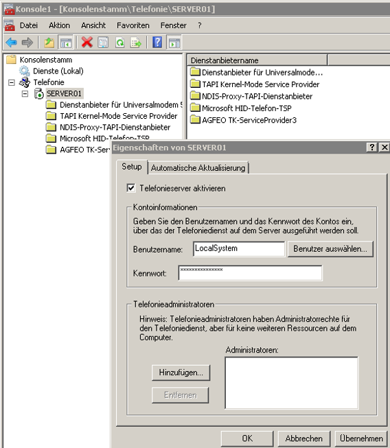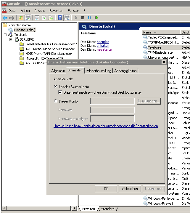 Ggf. ist ein Neustart des Telefonie-Dienstes am Server erforderlich, damit die TAPI-Lines am Client erscheine