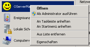 - Recht: <als Dienst anmelden>. Dieses wird automatisch vergeben, wenn man unter Systemsteuerung – Verwaltung – Dienste dem OServer-Dienst das entsprechende Benutzerkonto manuell zuordnet, alternativ kann das Recht unter Systemsteuerung – Verwaltung – Lokale Sicherheitseinstellungen vergeben werden.