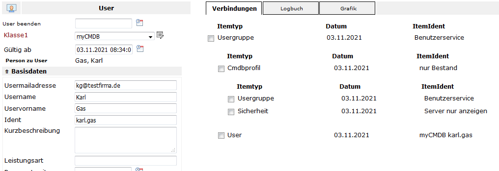 Der User "Gas" in diesem Bild ist in der Usergruppe "Benutzerservice", die das CMDBProfil "nur Bestand" hat und das CMDBProfil hat die Sicherheit "Server nur anzeigen":