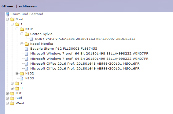 Der Treeview "Raum+Bestand" zeigt die Räume, die zugeordneten Personen und die Bestandsdaten zu den Personen. Ist eine Bestandsitem ohne Personenzuordnung direkt einem Raum zugeordnet (z.B.Serverraum), dann werden diese direkt unter der Organisation angezeigt.
